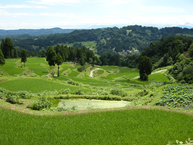 自然と伝統が調和する棚田は松之山の自慢の一つです。雪解け水を温める温水路、棚田づたいに流れる天水、土の高い畦、田んぼの脇に植えられたはせがけ用のスギ、棚田を囲むブナ林などどれも雪国ならではの棚田です。