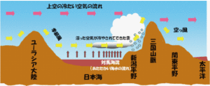 冬、ユーラシア大陸から日本に向かい季節風が吹いています。この季節風が日本海から蒸発する水蒸気をもらい、この水蒸気から雪雲ができます。この雪雲が山脈にぶつかって上空に押し上げられ、冷たくなって雪になるのです。