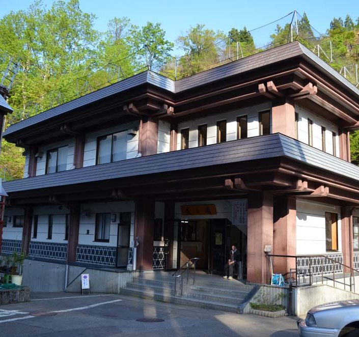 松之山温泉街 日帰り入浴施設「鷹の湯」前の道路を工事しています。