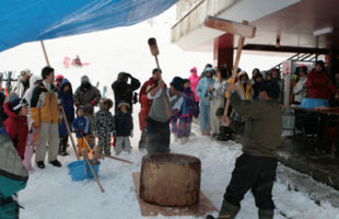 新年を祝い、スキー場来場者へつきたてのおもちを無料サービス。餅つきを体験…